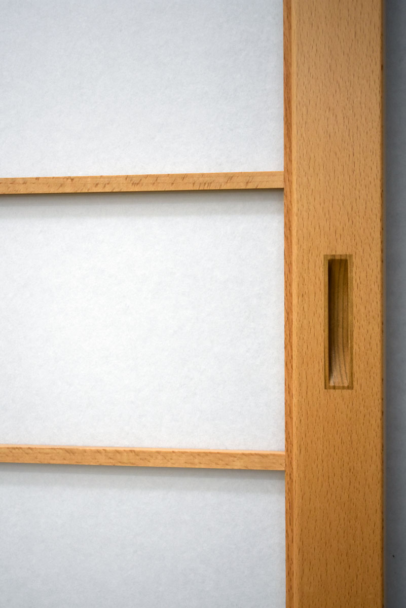 Shoji screens built in Beech with beech lower door panels, 0.3 mm White Warlon paper and inlaid Japanese cherry door pulls. Each shoji 23-3/4" x 78-1/8" x 1-3/8".